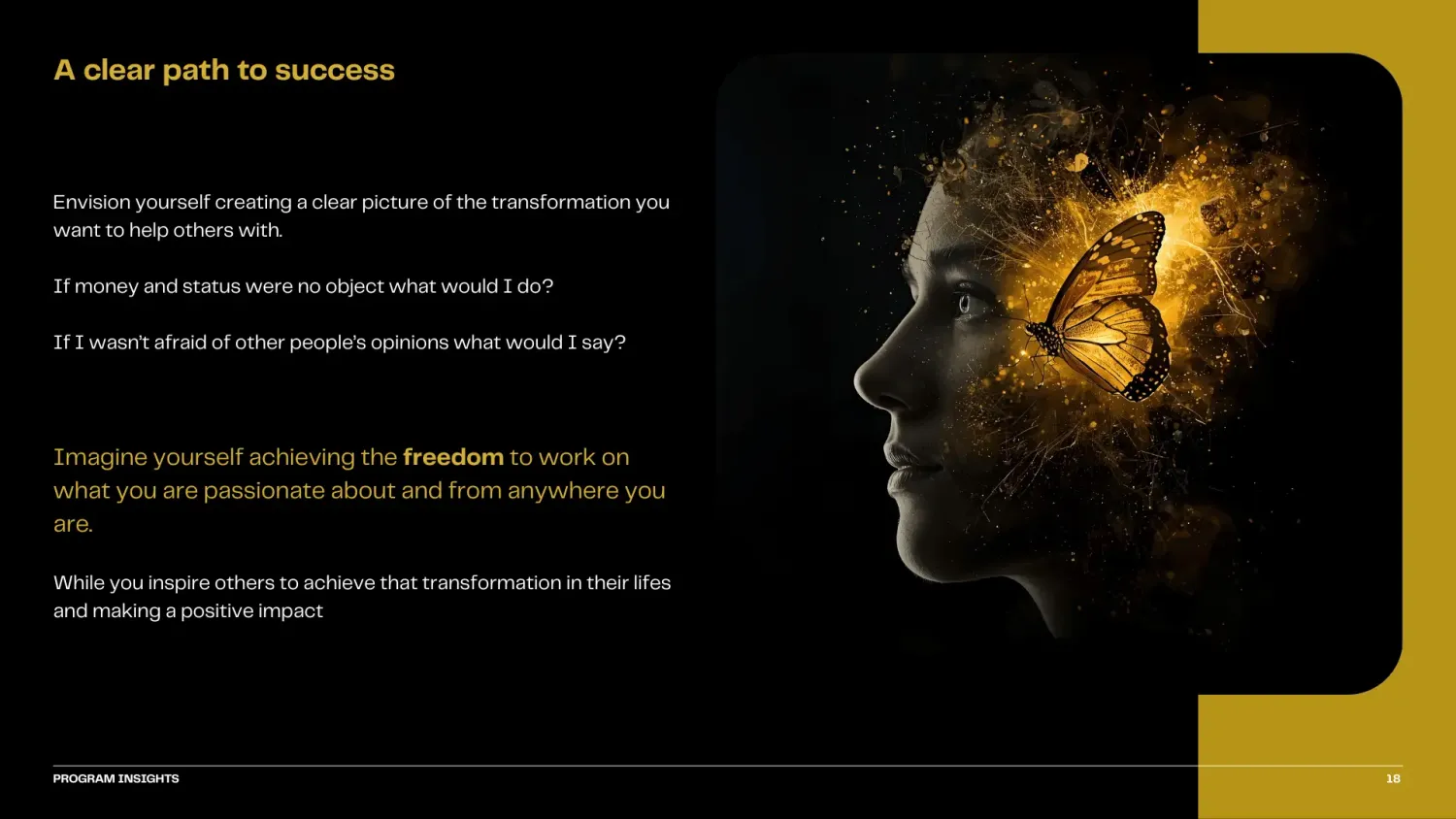 Training to build confidence on the value you offer. The focus is on building trust authentically, and giving you a structure to guide yourself in the calls with potential clients to focus on helping them get where they want to go, instead of selling forcefully.